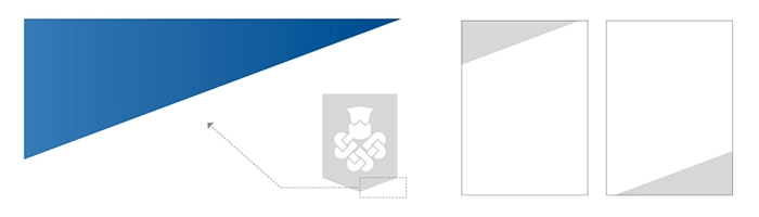 De herkenbaarheid van de huisstijl zit hem in de schuine vlakken. De hoek van de schuine vlakken is hetzelfde als de hoek onderaan het schild van het beeldmerk. De schuine vlakken moeten in de uitingen terug komen en zo voor herkenbaarheid gaan zorgen. Ook de onderkant van het schild behoord tot de optionele elementen.